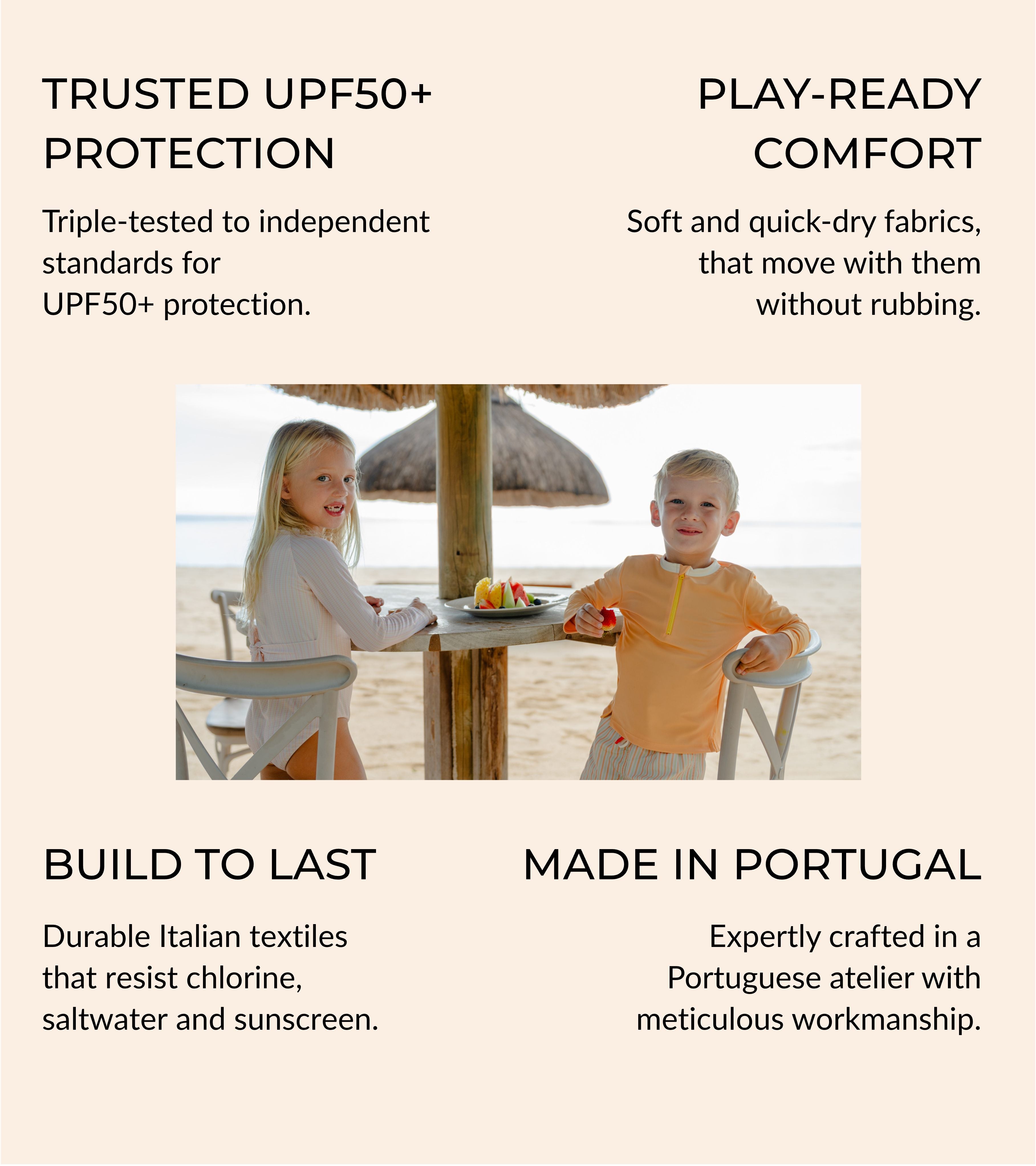 Sun safety meets high-performance comfort. Silky-soft, quick-dry fabrics made for all-day splashes.