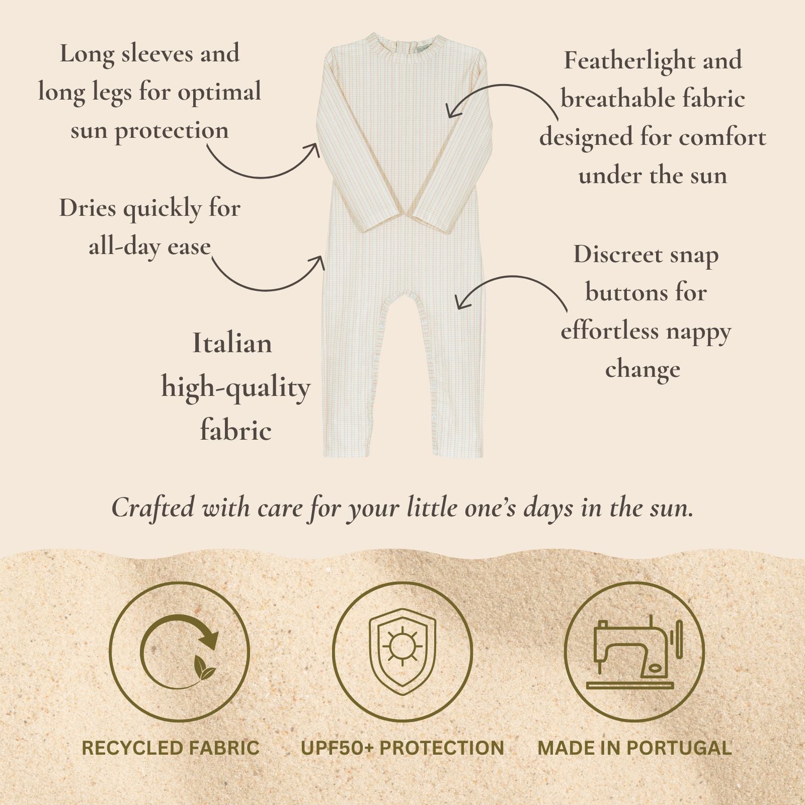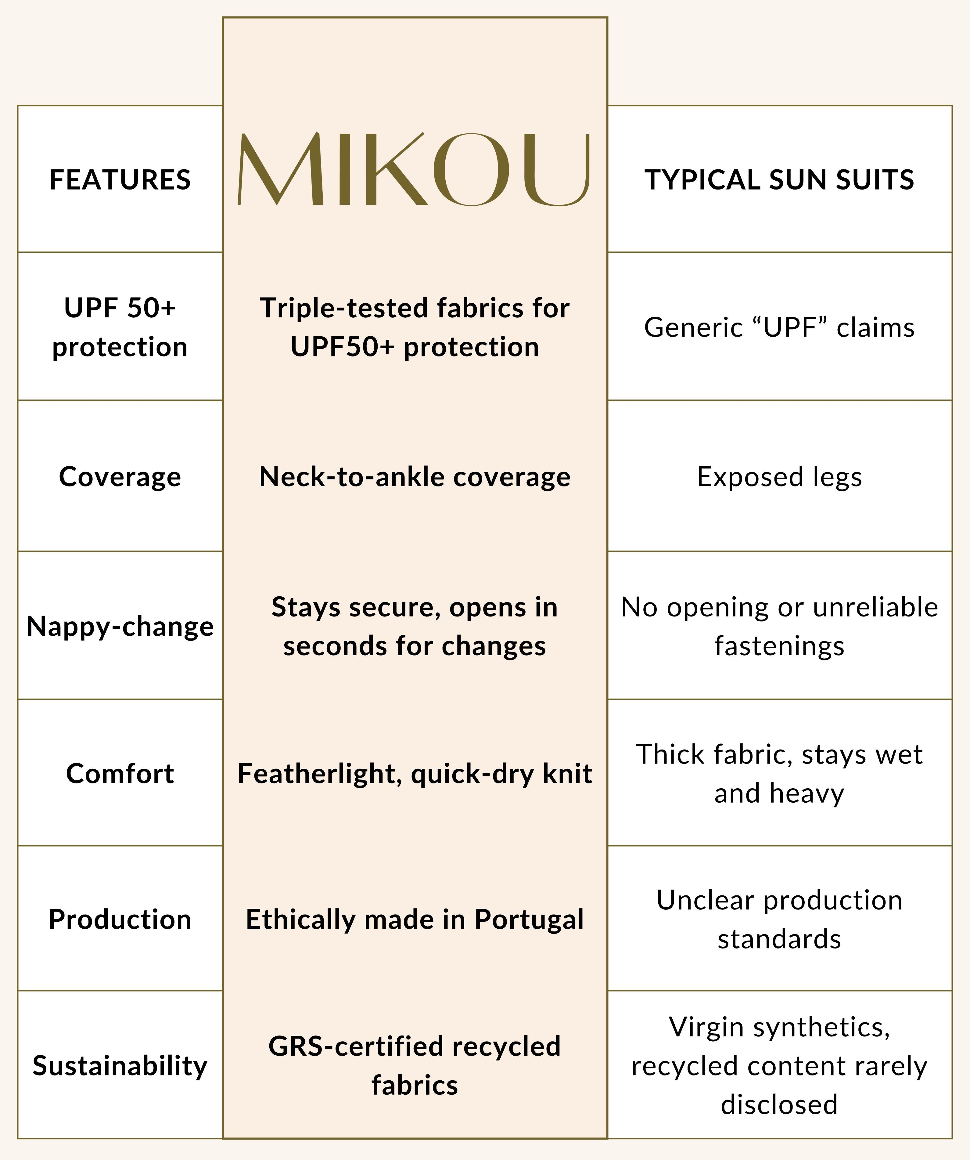 Full body coverage, Mikou’s signature sun suit. Crafted from high-performance UPF50+ fabric, our sun suit offers complete UV-protection for delicate skin. Thoughtfully designed for easy changes, so you can enjoy sunny days with peace of mind.