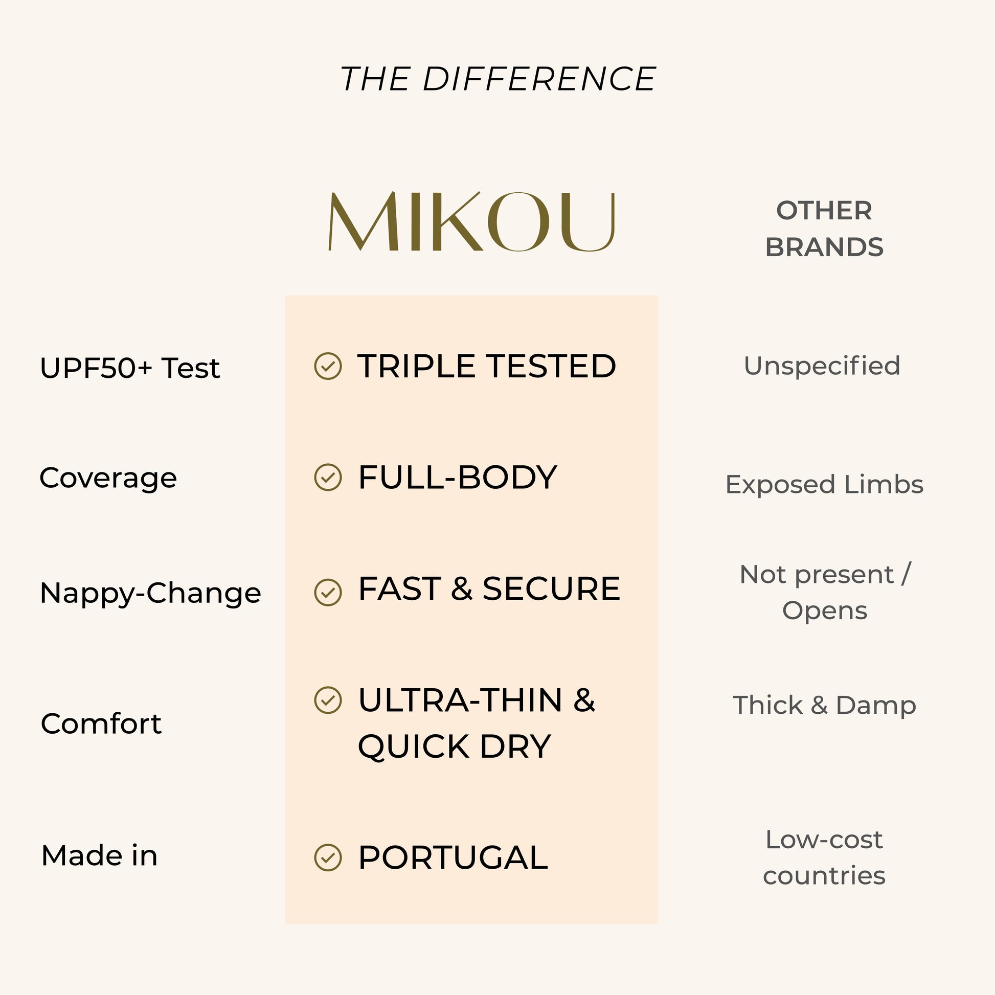 Our fabric is OEKO-TEX® and GRS certified, guaranteeing it's free from harmful substances. The UPF50+ protection meets the strictest Australian, European, and American testing standards. And our Portuguese factory is Intertek certified for ethical working conditions.